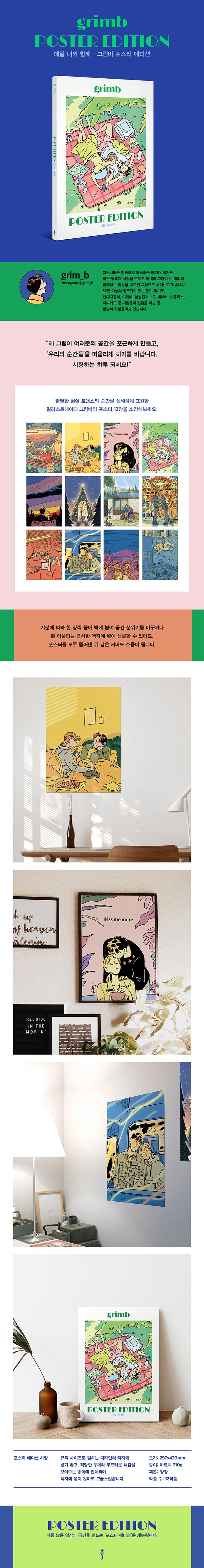 《매일 너와 함께 - 그림비 포스터 에디션》은 인기 일러스트레이터 그림비로 활동하는 배성태 작가의 작품 12개가 엄선된 포스터 모음집이다. 달달한 현실 로맨스의 순간을 섬세하게 포착한 그림들로, 기분에 따라 한 장씩 뜯어 벽에 붙여 공간 분위기를 바꾸거나 잘 어울리는 근사한 액자에 넣어 선물할 수도 있다. 포스터를 모두 떼어낸 뒤 남은 커버도 양장으로 제작되어 튼튼하므로 세워두는 것만으로 소품처럼 활용할 수 있다.