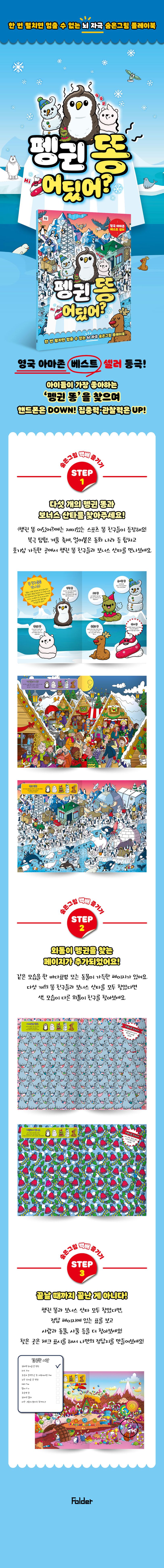 출간 직후 영국 아마존 베스트셀러에 등극한 숨은그림찾기 책이 출간되었습니다. 이 책은 아이들의 눈높이에 맞춘 ‘펭귄 똥’을 찾으며 인내력, 관찰력을 기를 수 있습니다. 무엇보다 찾아야 하는 대상이 아이들이 가장 좋아하는 똥이므로 집중력이 약한 아이들도 오랫동안 놀이에 몰두할 수 있습니다.