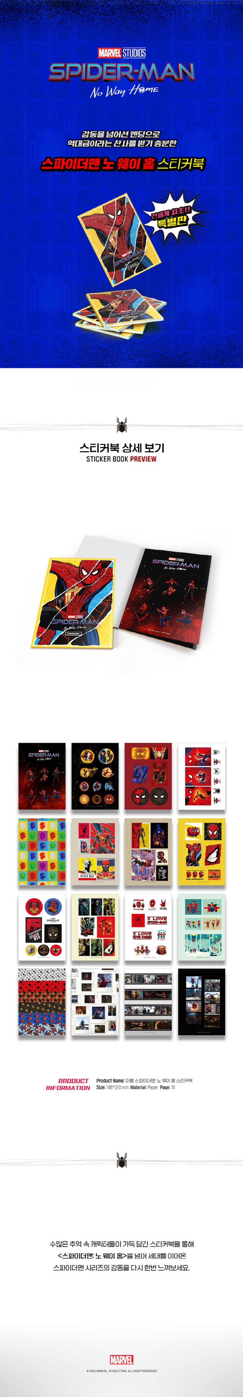 〈스파이더맨: 노 웨이 홈〉의 잊을 수 없는 명장면들과 개성 넘치는 아트워크들로 구성된 ≪스파이더맨: 노 웨이 홈 스티커북≫은 전 세계 한국에서만 만날 수 있는 특별한 제품입니다.
