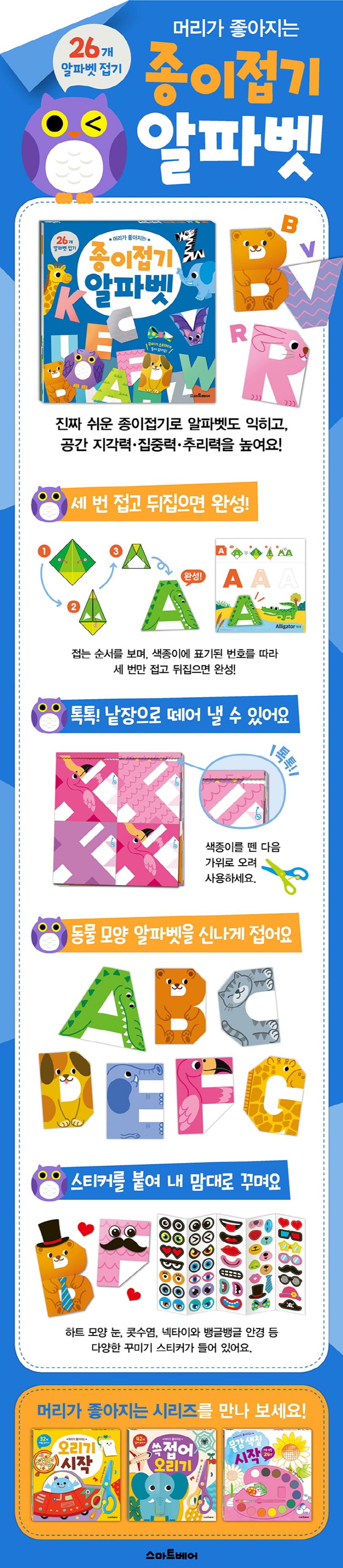종이접기는 손가락을 활용한 놀이로, 소근육 발달은 물론 창의력 · 관찰력 향상에 효과적입니다. 평면의 색종이가 입체적인 형태로 바뀌는 것을 경험하며 상상력과 공간 지각력을 키우고, 접는 순서에 맞춰 하나하나 접다 보면 집중력도 기르게 됩니다. 알파벳과 접목시킨 종이접기 놀이로 대문자 26개의 모양을 익히며 차근차근 종이접기를 시작해 보세요.