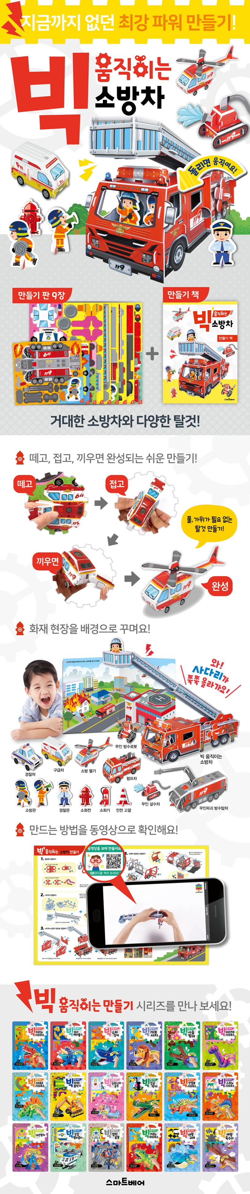 〈빅 움직이는 만들기〉 시리즈는 만들기를 처음 시작하는 아이도 떼고, 접고, 끼우는 비교적 간단한 방법으로 완성도 높은 입체 모형을 만들며 자신감과 성취감을 느낄 수 있습니다. 가위를 사용하지 않아 편리하고, 만들기 재료를 준비해야 하는 번거로움이 없어 안전하고 간편하지요. 빅 움직이는 소방차 외에 소방 헬기, 무인파괴 방수탑차, 펌프차, 경찰차, 구급차 등 화재 현장에 출동하는 탈것 및 소방용품 15종이 골고루 들어 있어 다양한 놀이 활동이 가능합니다. 지금까지 없던 최강 파워 만들기 책으로 실감 나는 화재 출동 현장을 꾸며 보세요!