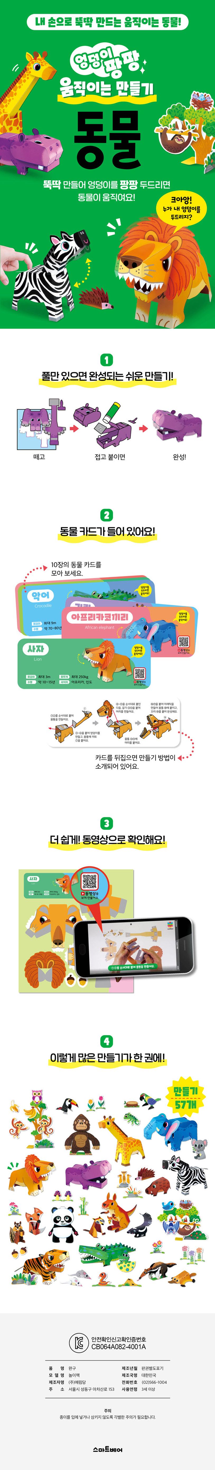 〈엉덩이 팡팡 움직이는 만들기-동물〉은 유아들이 혼자서 할 수 있는 움직이는 입체 동물 만들기 책으로, 직접 만든 동물의 엉덩이를 팡팡 두드리면 움직이도록 설계되었습니다. 종이를 떼고, 선을 따라 접고, 순서대로 풀칠해 붙이는 활동만으로도 한 마리의 움직이는 동물이 완성되는 즐거움을 얻을 수 있습니다.