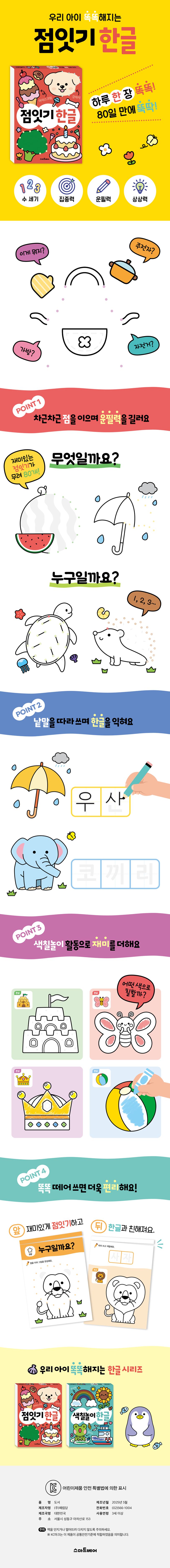 만 3~5세는 아이의 두뇌가 종합적으로 발달하는 시기입니다. 이 시기에는 아 이의 흥미를 기반으로 한 놀이 중심의 활동이 두뇌 발달에 가장 효과적입니다. 〈점잇기 한글〉은 재미있게 점잇기를 하면서 자연스럽게 한글과 친해지도록 도 와주는 책입니다. 아이들의 호기심을 자극하는 귀여운 그림으로 구성된 점잇 기 80개를 담았어요. 반쪽 점잇기, 모양 점잇기, 숫자 점잇기의 3단계로 구성되어 있으며, 한 장씩 똑 똑 떼어 쓸 수 있어서 아이가 스스로 좋아하는 그림을 고를 수 있어요. 어떤 그림이 완성될지 예측하다 보면 호기심과 문제 해결력, 자기 주도성이 자연스럽게 길러집니다. 아이는 간단한 점잇기로 자신감을 얻은 다음에 점차 복잡한 점잇기에 도전하며 성취감을 느낍니다.