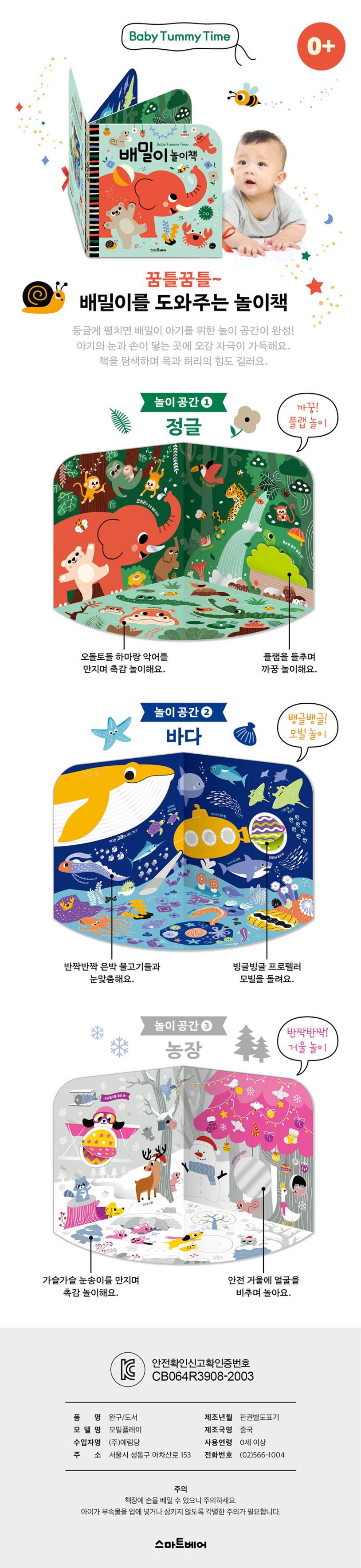 〈배밀이 놀이책〉은 배밀이 시기의 아기들을 위한 감각 자극 토이북입니다. 책을 둥글게 펼쳐 리본을 묶으면 아기만의 안락하고 멋진 놀이 공간이 마련됩니다. 놀이 공간은 정글, 바다, 농장 세 가지 테마입니다. 알록달록한 그림에는 아기의 시각을 자극해 주는 반짝반짝한 은박 장식이 시선을 끌며, 아기의 촉각을 자극하는 오돌토돌한 글리터 가공이 되어 있습니다. 뿐만 아니라 펠트로 된 플랩과 뱅글뱅글 돌아가는 입체 모빌, 그리고 큼지막한 안전 거울은 아기의 놀이를 더욱 풍성하게 도와줍니다.