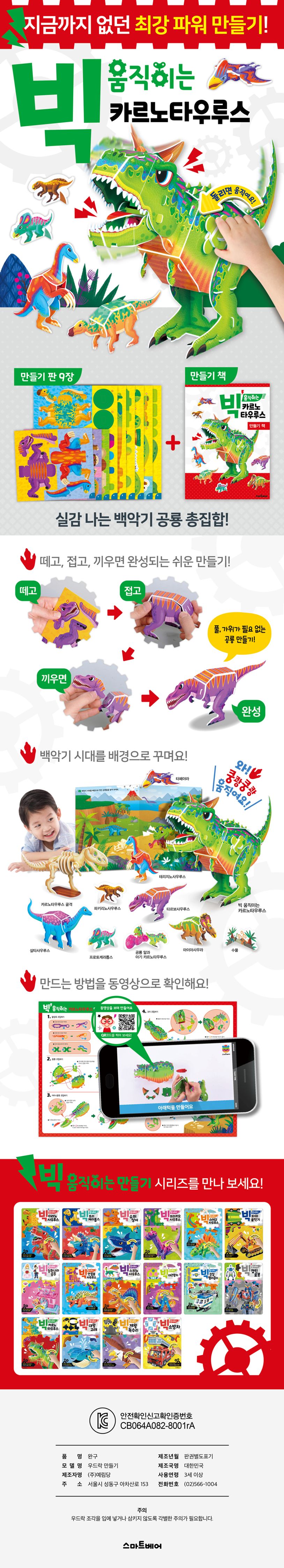 내가 만든 카르노타우루스가 쿵쾅쿵쾅 움직여요! 머리에 황소 뿔이 난 거대한 육식 공룡 카르노타우루스를 〈빅 움직이는 만들기〉 시리즈로 만나 보세요. 〈빅 움직이는 카르노타우루스〉는 돌림축이 돌아가는 원리를 이용해 입과 꼬리가 움직이도록 설계하여 아이들에게 만드는 재미와 즐거움을 주고, 과학적 사고는 물론 창의력과 입체적인 사고력을 키우는 데 도움을 줍니다. 또한 평면 그림이 입체 모형으로 바뀌는 과정을 경험하며 도형과 공간 개념을 인지하게 됩니다. 〈빅 움직이는 만들기〉 시리즈는 만들기를 처음 시작하는 아이도 떼고, 접고, 끼우는 비교적 간단한 방법으로 완성도 높은 입체 모형을 만들며 자신감과 성취감을 느낄 수 있습니다. 가위를 사용하지 않아 편리하고, 만들기 재료를 준비해야 하는 번거로움이 없어 간편한 놀이 시간을 가질 수 있지요. 빅 움직이는 카르노타우루스 외에 타르보사우루스, 테리지노사우루스 등 백악기 시대 공룡들과 함께 카르노타우루스 골격, 공룡 알과 아기 카르노타우루스까지 11종이 들어 있어 다양한 놀이 활동이 가능합니다. 지금까지 없던 최강 파워 만들기 책으로 놀라운 공룡의 세계를 체험하세요!