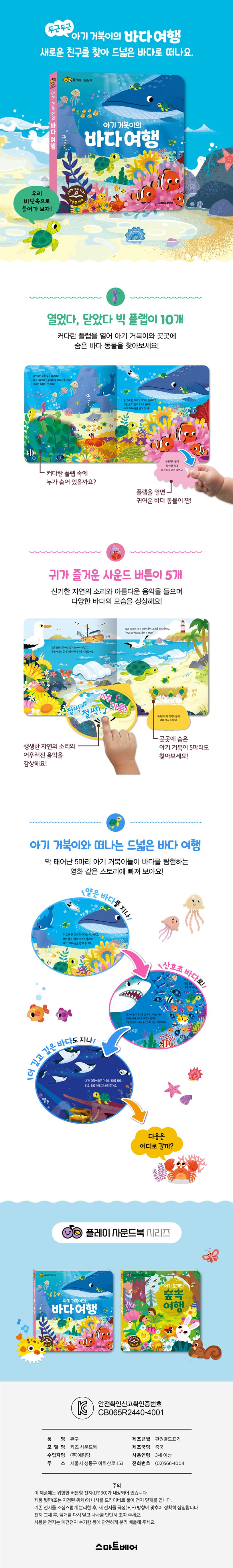 이책의특징1.열었다,닫았다빅플랩이10개있어요!커다란플랩속에누가숨어있을지상상하며요리조리들춰보세요.펼친플랩속에숨어있는아기거북과바다동물을찾아보고플랩뒤에적힌의성어의태어가들어간쉬운문장을접하면서소근육발달은물론,상상력과언어감각도자연스럽게자라납니다.2.아이들의귀가즐거운사운드버튼을눌러요!매페이지마다장면에어울리는자연의소리와음악을들을수있는터치사운드버튼이있어요.바닷가에서들을수있는소리와아름답게어우러진음악을감상할수있지요.다양한소리를접하고어떤소리일지맞혀보며아이가말과동작으로흉내내는말을재미있게표현해볼수있게북돋아주세요.3.흥미진진한스토리로책읽기의즐거움을선사해요! 막태어난아기거북이5마리가바다를탐험하는내용으로구성되어있어요.실제바닷속은수심에따라수생환경이크게달라져요.어떤바다에서어떤바다동물을만나게될지궁금하지않나요?거북이의눈으로바다의이곳저곳을관찰해보고,어떤동물들이있는지그이름과특징에대해이야기를나눠보세요!4.숨은그림찾기로재미를더해요!<아기거북이의바다여행>은매페이지마다아기거북이들이곳곳에숨어있어요.이야기를읽으며5마리아기거북이들을찾다보면성취감도느낄수있고,이야기에더깊이빠져들게될거예요.5.어린이제품안전검사KC인증마크를확인하세요!어린이제품안전검사를통과해안심하고사용할수있어요.또한책의날카로운모서리부분을둥글게제작하여아이가다칠위험이없어요.*인증유형:안전확인CB065R2440-4001