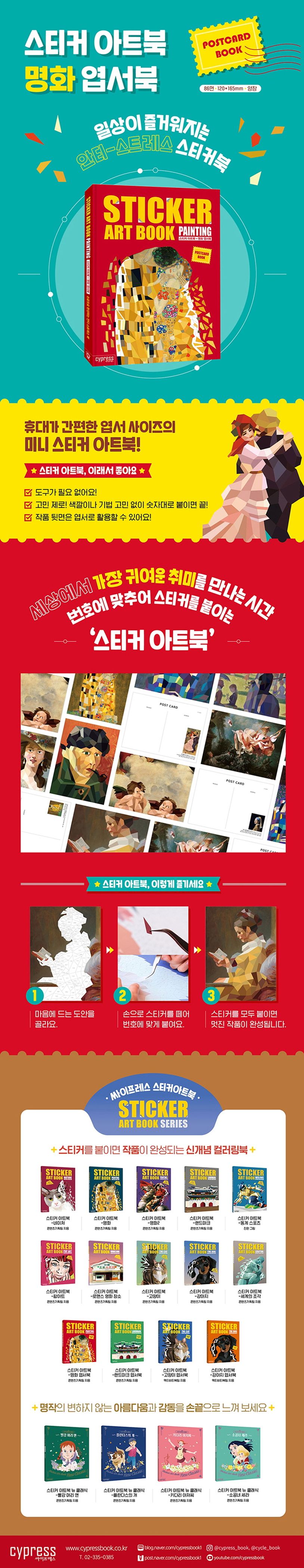 스티커를 붙여 나만의 작품을 완성하는 스티커 액티비티 도서 『스티커 아트북: 명화 엽서북』. 《스티커 아트북: 명화》, 《스티커 아트북: 명화》 제2권의 10가지 인기 작품을 선별해 수록하였다. 엽서 사이즈에 맞게 재구성한 버전으로, 아기자기하고 섬세한 작품을 즐길 수 있어 기존의 스티커 아트북과는 또 다른 매력을 느낄 수 있다. 또한 가방에 쏙 들어가는 미니 사이즈로 휴대성과 편리함을 더했다.