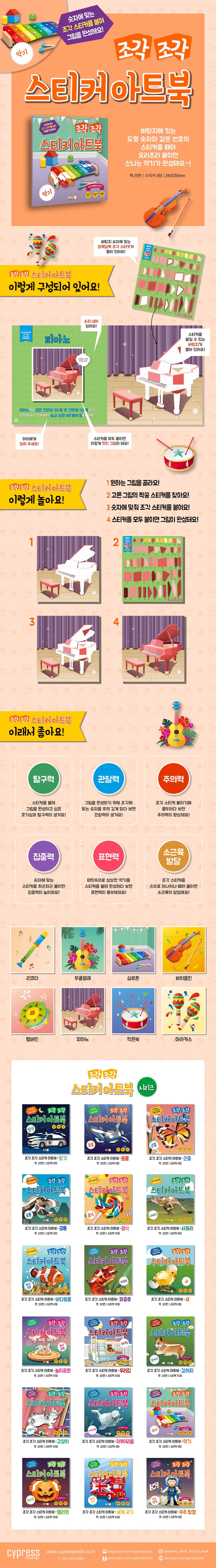 아이가 작은 손으로 스티커를 떼어 바탕지에 있는 도형 모양에 맞게 요리조리 움직여 스티커를 붙이면 멋진 악기가 완성돼요. 알록달록한 색깔의 건반을 두드리는 실로폰, ‘악기의 여왕’이라는 별명을 가진 바이올린, 검은 건반과 흰 건반이 있는 피아노, 흔들면 차카차카 하는 소리가 나는 마라카스 등 아이들이 좋아하는 다양한 악기로 구성되어 있어요. 『조각 조각 스티커 아트북』은 별다른 도구 없이 손으로 스티커를 떼어내 붙이기만 하면 멋진 그림이 완성돼요. 번호에 맞추어 스티커를 붙이면 집중력과 주의력은 물론이고 탐구력, 관찰력, 표현력이 쑥쑥 향상돼요. 또 조각 스티커를 손으로 하나하나 떼어 붙이다 보면 아이 손의 소근육도 함께 발달한답니다. 숫자에 맞는 조각 스티커를 차근차근 붙여 흥겨운 소리를 내는 악기를 완성해보세요.