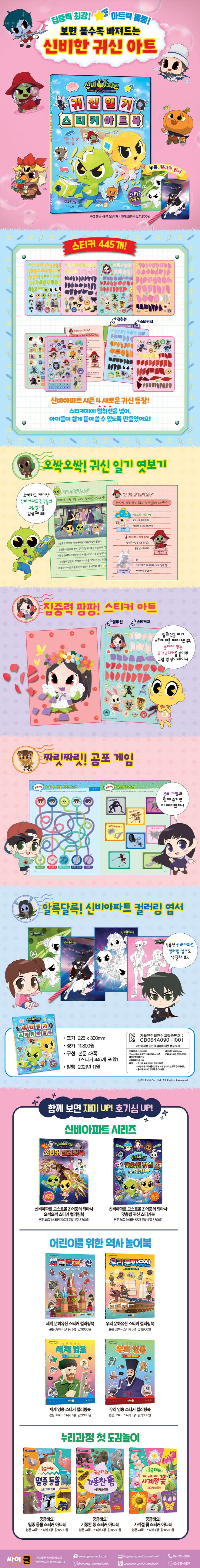인기 애니메이션 ‘신비아파트 시즌 4’가 조각조각 스티커 아트로 재탄생했어요. 『신비아파트 고스트볼 Z 어둠의 퇴마사 귀신 일기 스티커 아트북』에는 귀염뽀짝 도깨비 신비와 금비는 물론 하리와 친구들, 그리고 어마 무시한 귀신들까지 총출동해요. 신비아파트 친구들의 오싹하고 재미난 그림일기를 보며, 조각 스티커를 하나하나 붙여 작품을 완성하다 보면 잠들어 있던 집중력과 아트력이 폭발한답니다. 또 ‘요술 아이템 미로’와 ‘같은 포즈 귀신 찾기’ 등의 공포 게임을 즐기며, 스릴과 재미를 만끽할 수 있어요. ‘조각 아트 기법’으로 재탄생해 원작 그림과는 또 다른 색다른 즐거움을 선사하는 『신비아파트 고스트볼 Z 어둠의 퇴마사 귀신 일기 스티커 아트북』의 오싹한 재미 속에 퐁당 빠져 보세요~!