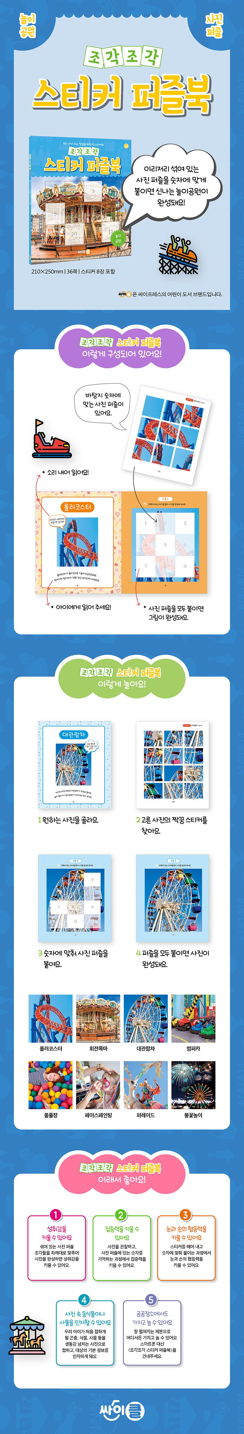 《조각 조각 스티커 퍼즐북-놀이공원》에는 롤러코스터, 회전목마, 범퍼카, 퍼레이드 등 아이들이 궁금해하고 좋아하는 놀이공원의 모습을 담았어요. 사진 퍼즐을 완성한 뒤, 사진 아래 있는 설명글을 아이에게 읽어 주면서 대화를 나눠 보세요. 아이가 스스로 만든 관찰 책이 된답니다.