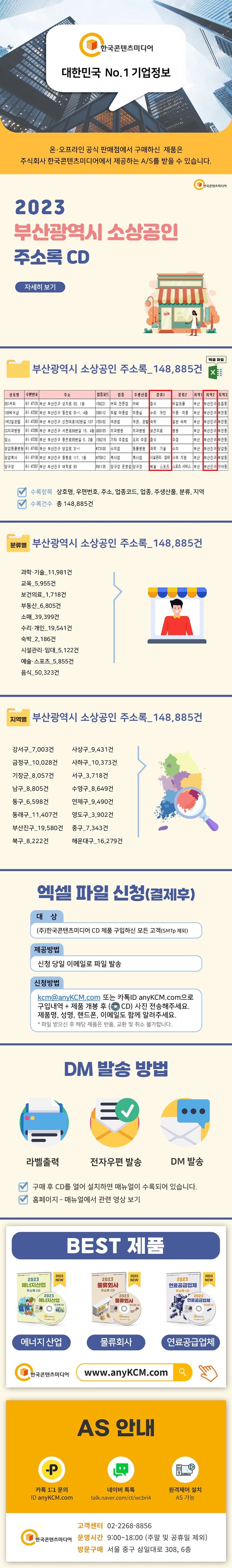 ▶〈2023부산광역시소상공인주소록CD〉란?부산광역시소상공인주소록을분류별,지역별로148,885건을수록했습니다.※엑셀파일로사용자가편리하게수정·편집·출력할수있습니다.〈책임의한계와법적고지〉·본제품의저작권및판권은주식회사한국콘텐츠미디어에있으며저작권법및소프트웨어법에의해보호받는라이센스저작물이므로무단복제및무단전재를금합니다.·본제품의자료수집한계로인해그정확도가일부제한됨을알려드립니다.·본제품을활용하여영리성광고정보전송을하는경우정보이용촉진및정보보호등에관한법률제50조에따른준수사항을반드시지켜야하며이를어길경우관련법에따라처벌받을수있습니다.·본제품사용에따른결과및판단은민형사를포함한일체가전적으로사용자(사)에게책임이있습니다.·본제품은전자출판물로서해당법령및실천요강을준수합니다.