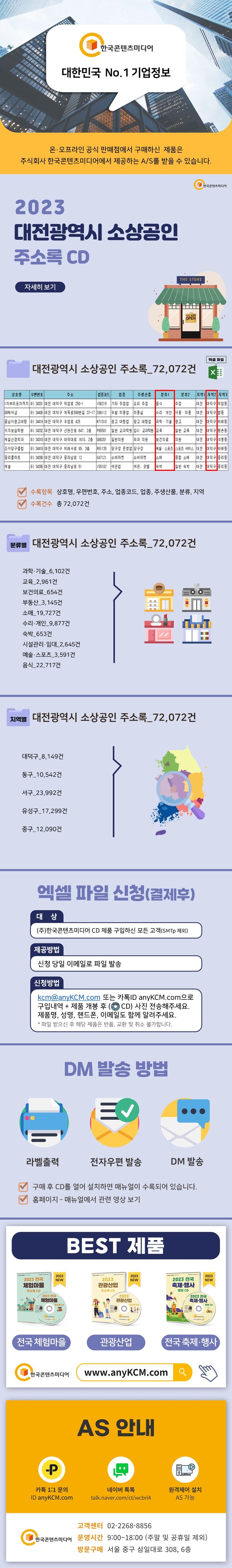 ▶〈2023대전광역시소상공인주소록CD〉란?대전광역시소상공인주소록을분류별,지역별로72,072건을수록했습니다.※엑셀파일로사용자가편리하게수정·편집·출력할수있습니다.〈책임의한계와법적고지〉·본제품의저작권및판권은주식회사한국콘텐츠미디어에있으며저작권법및소프트웨어법에의해보호받는라이센스저작물이므로무단복제및무단전재를금합니다.·본제품의자료수집한계로인해그정확도가일부제한됨을알려드립니다.·본제품을활용하여영리성광고정보전송을하는경우정보이용촉진및정보보호등에관한법률제50조에따른준수사항을반드시지켜야하며이를어길경우관련법에따라처벌받을수있습니다.·본제품사용에따른결과및판단은민형사를포함한일체가전적으로사용자(사)에게책임이있습니다.·본제품은전자출판물로서해당법령및실천요강을준수합니다.