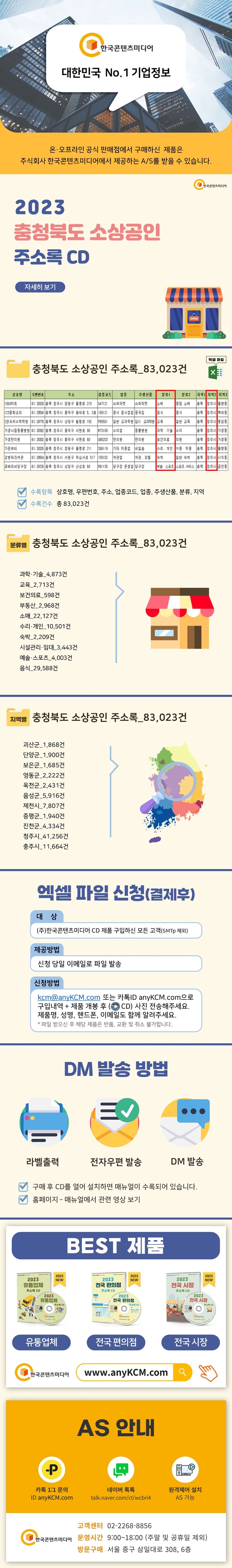 ▶〈2023충청북도소상공인주소록CD〉란?충청북도소상공인주소록을분류별,지역별로83,023건을수록했습니다.※엑셀파일로사용자가편리하게수정·편집·출력할수있습니다.〈책임의한계와법적고지〉·본제품의저작권및판권은주식회사한국콘텐츠미디어에있으며저작권법및소프트웨어법에의해보호받는라이센스저작물이므로무단복제및무단전재를금합니다.·본제품의자료수집한계로인해그정확도가일부제한됨을알려드립니다.·본제품을활용하여영리성광고정보전송을하는경우정보이용촉진및정보보호등에관한법률제50조에따른준수사항을반드시지켜야하며이를어길경우관련법에따라처벌받을수있습니다.·본제품사용에따른결과및판단은민형사를포함한일체가전적으로사용자(사)에게책임이있습니다.·본제품은전자출판물로서해당법령및실천요강을준수합니다.