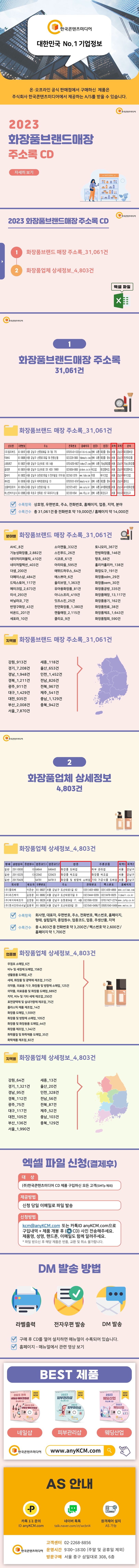 1.화장품브랜드매장주소록_31,061건수록항목:상호명,우편번호,주소,전화번호,홈페이지,업종,지역,분야수록건수:총31,061건중전화번호약19,000건/홈페이지약14,000건●분야별①AHC_8건②기능성화장품_2,882건③네이처리퍼블릭_410건④네이처컬렉션_403건⑤더샘_200건⑥더페이스샵_484건⑦드럭스토어_117건⑧메이크업_2,673건⑨미샤_293건⑩바닐라코_7건⑪반영구화장_43건⑫비욘드_201건⑬세포라_10건⑭소이캔들_332건⑮스킨푸드_26건⑯시코르_61건⑰아리따움_595건⑱에뛰드하우스_64건⑲에스쁘아_6건⑳올리브영_1,363건㉑유아용화장품_81건㉒이니스프리_419건㉓잇츠스킨_25건㉔천연화장품_1,380건㉕캔들매장_2,115건㉖클리오_9건㉗토니모리_367건㉘한방화장품_146건㉙향초_68건㉚홀리카홀리카_138건㉛화장도구_191건㉜화장품odm_29건㉝화장품oem_30건㉞화장품공방_335건㉟화장품매장_13,117건㊱화장품용기_162건㊲화장품원료_38건㊳화장품제조_1,643건㊴화장품협회_590건●지역별①강원_913건②경기_7,208건③경남_1,948건④경북_1,211건⑤광주_911건⑥대구_1,429건⑦대전_935건⑧부산_2,008건⑨서울_7,870건⑩세종_118건⑪울산_653건⑫인천_1,452건⑬전남_826건⑭전북_967건⑮제주_541건⑯충남_1,129건⑰충북_942건2.화장품업체상세정보_4,803건수록항목:회사명,대표자,우편번호,주소,전화번호,팩스번호,홈페이지,형태,설립일자,종업원수,업종코드,업종,주생산품,지역수록건수:총4,803건중전화번호약3,200건/팩스번호약2,600건/홈페이지약1,700건●업종별①무점포소매업_6건②비누및세정제도매업_158건③생활용품도매업_4건④세제,화장품및광택제제조업_315건⑤의약품,의료용기구,화장품및방향제소매업_125건⑥의약품,의료용품및화장품도매업_689건⑦치약,비누및기타세제제조업_250건⑧표면광택제및실내가향제제조업_75건⑨플라스틱제품제조업_14건⑩화장품도매업_1,559건⑪화장품및방향제소매업_105건⑫화장품및화장용품도매업_44건⑬화장품제조업_1,342건⑭화학물질및화학제품도매업_35건⑮화학제품제조업_82건●지역별①강원_64건②경기_1,321건③경남_95건④경북_112건⑤광주_75건⑥대구_117건⑦대전_105건⑧부산_136건⑨서울_1,990건⑩세종_13건⑪울산_20건⑫인천_328건⑬전남_56건⑭전북_87건⑮제주_52건⑯충남_103건⑰충북_129건