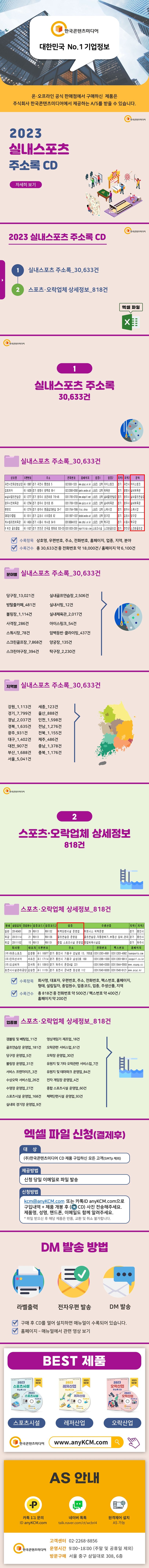1.실내스포츠주소록_30,633건수록항목:상호명,우편번호,주소,전화번호,홈페이지,업종,지역,분야수록건수:총30,633건중전화번호약18,000건/홈페이지약6,100건●분야별①당구장_13,021건②방탈출카페_481건③볼링장_1,114건④사격장_286건⑤스쿼시장_78건⑥스크린골프장_7,868건⑦스크린야구장_394건⑧실내골프연습장_2,506건⑨실내서핑_12건⑩실내체육관_2,017건⑪아이스링크_54건⑫암벽등반·클라이밍_437건⑬양궁장_135건⑭탁구장_2,230건●지역별①강원_1,113건②경기_7,799건③경남_2,037건④경북_1,635건⑤광주_931건⑥대구_1,402건⑦대전_907건⑧부산_1,688건⑨서울_5,041건⑩세종_123건⑪울산_888건⑫인천_1,598건⑬전남_1,276건⑭전북_1,155건⑮제주_486건⑯충남_1,378건⑰충북_1,176건2.스포츠·오락업체상세정보_818건수록항목:회사명,대표자,우편번호,주소,전화번호,팩스번호,홈페이지,형태,설립일자,종업원수,업종코드,업종,주생산품,지역수록건수:총818건중전화번호약500건/팩스번호약400건/홈페이지약200건●업종별①갬블링및베팅업_11건②골프연습장운영업_181건③당구장운영업_5건④볼링장운영업_31건⑤서비스프랜차이즈_3건⑥수상오락서비스업_26건⑦수영장운영업_27건⑧스포츠시설운영업_168건⑨실내외경기장운영업_9건⑩영상게임기제조업_18건⑪오락관련서비스업_61건⑫오락장운영업_30건⑬유원지및기타오락관련서비스업_7건⑭유원지및테마파크운영업_84건⑮전자게임장운영업_4건⑯종합스포츠시설운영업_60건⑰체력단련시설운영업_93건