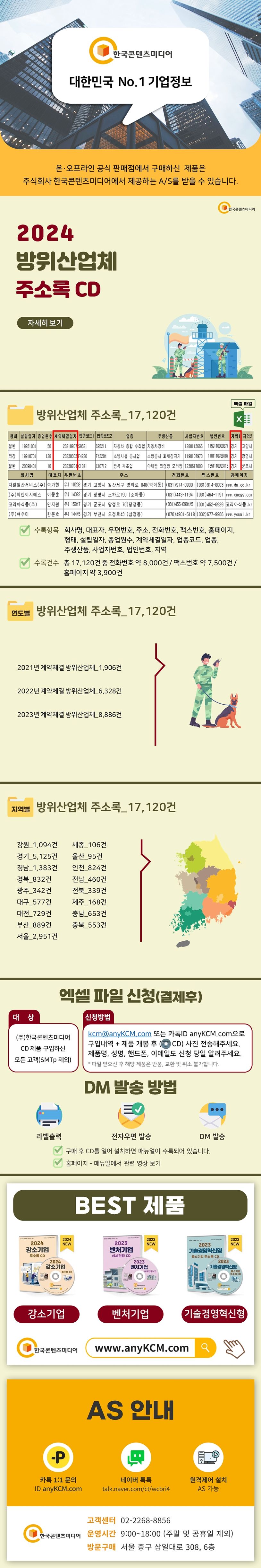 ▶〈2024방위산업체주소록CD〉란?방위산업체주소록을연도별,지역별로17,120건을수록했습니다.▶〈2024방위산업체주소록CD〉특징은?1.주식회사한국콘텐츠미디어는1999년설립해매년300종의업종별주소록,기업정보데이터베이스를출시하고있어제품의품질및AS를보증합니다.2.엑셀파일을자유롭게수정·편집·출력할수있습니다.3.연도별,지역별로상세하게분류했습니다.4.자료의정확성을위해최신행정구역을반영했습니다.5.DM발송가이드(엑셀/폼텍/전자우편/우체국/마케팅등)를제공합니다.〈책임의한계와법적고지〉·본제품의저작권및판권은주식회사한국콘텐츠미디어에있으며저작권법및소프트웨어법에의해보호받는라이센스저작물이므로무단복제및무단전재를금합니다.·본제품의자료수집한계로인해그정확도가일부제한됨을알려드립니다.·본제품을활용하여영리성광고정보전송을하는경우정보이용촉진및정보보호등에관한법률제50조에따른준수사항을반드시지켜야하며이를어길경우관련법에따라처벌받을수있습니다.·본제품사용에따른결과및판단은민형사를포함한일체가전적으로사용자(사)에게책임이있습니다.·본제품은전자출판물로서해당법령및실천요강을준수합니다.