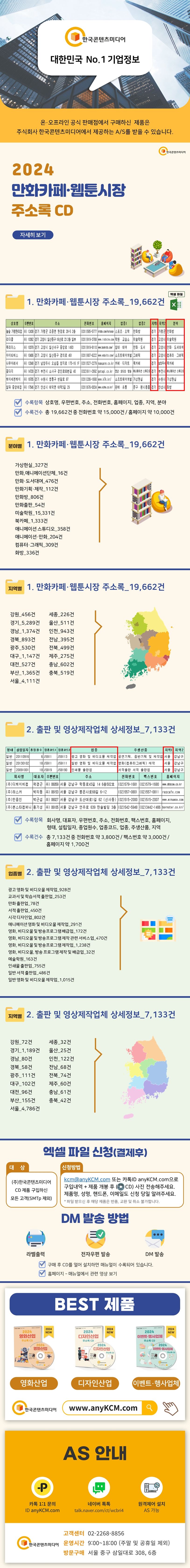1.만화카페·웹툰시장주소록_19,662건수록항목:상호명,우편번호,주소,전화번호,홈페이지,업종,지역,분야수록건수:총19,662건중전화번호약15,000건/홈페이지약10,000건●분야별①가상현실_327건②만화,애니메이션단체_16건③만화·도서대여_476건④만화기획·제작_112건⑤만화방_806건⑥만화출판_54건⑦미술학원_15,331건⑧북카페_1,333건⑨애니메이션스튜디오_358건⑩애니메이션·만화_204건⑪컴퓨터·그래픽_309건⑫화방_336건●지역별①강원_456건②경기_5,289건③경남_1,374건④경북_893건⑤광주_530건⑥대구_1,147건⑦대전_527건⑧부산_1,365건⑨서울_4,111건⑩세종_226건⑪울산_511건⑫인천_943건⑬전남_395건⑭전북_499건⑮제주_275건⑯충남_602건⑰충북_519건2.출판및영상제작업체상세정보_7,133건수록항목:회사명,대표자,우편번호,주소,전화번호,팩스번호,홈페이지,형태,설립일자,종업원수,업종코드,업종,주생산품,지역수록건수:총7,133건중전화번호약3,800건/팩스번호약3,000건/홈페이지약1,700건●업종별①광고영화및비디오물제작업_928건②교과서및학습서적출판업_253건③만화출판업_78건④서적출판업_450건⑤시각디자인업_802건⑥애니메이션영화및비디오물제작업_291건⑦영화,비디오물및방송프로그램배급업_172건⑧영화,비디오물및방송프로그램제작관련서비스업_470건⑨영화,비디오물및방송프로그램제작업_1,238건⑩영화,비디오물,방송프로그램제작및배급업_32건⑪예술학원_163건⑫인쇄물출판업_755건⑬일반서적출판업_486건⑭일반영화및비디오물제작업_1,015건●지역별①강원_72건②경기_1,189건③경남_80건④경북_58건⑤광주_111건⑥대구_102건⑦대전_96건⑧부산_155건⑨서울_4,786건⑩세종_32건⑪울산_25건⑫인천_122건⑬전남_68건⑭전북_74건⑮제주_60건⑯충남_61건⑰충북_42건