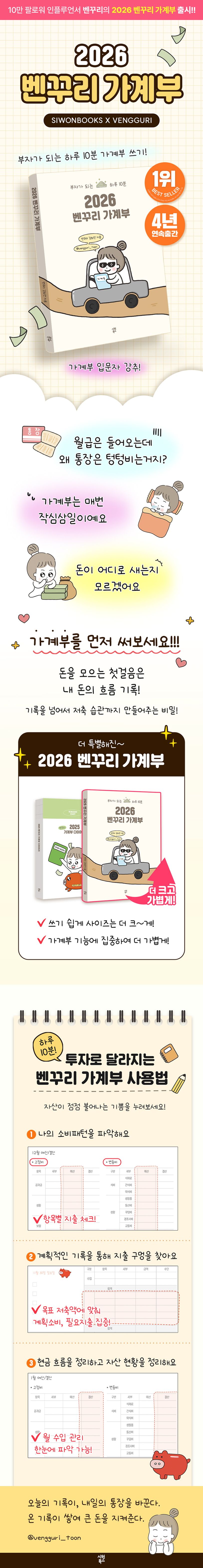 인플루언서이자 재테크툰으로 유명한 ‘돈 모으는 벤꾸리’의 2026년 가계부가 출시된다. 2022년 첫 출시되어 ‘계획형 J’를 위한 가계부+다이어리 포맷과 팬시한 감성으로 사랑받아 온 이 시리즈는 이번에는 ‘가계부’ 기능에 집중하고 내지도 쓰기 쉽도록 더 크게 바꾸었다. 다이어리 속지가 빠지면서 내지는 더 가벼워졌고 정가도 인하해 출간한다. 또한 출시 기념 30퍼센트 할인 가격으로 만나볼 수 있다. 하루 10분 지출 관리를 통해 ‘부자 되는 습관’을 기를 수 있는 2026 벤꾸리 가계부는 2025년 12월부터 2026년 1월~12월 총 13개월 구성으로 제공된다.