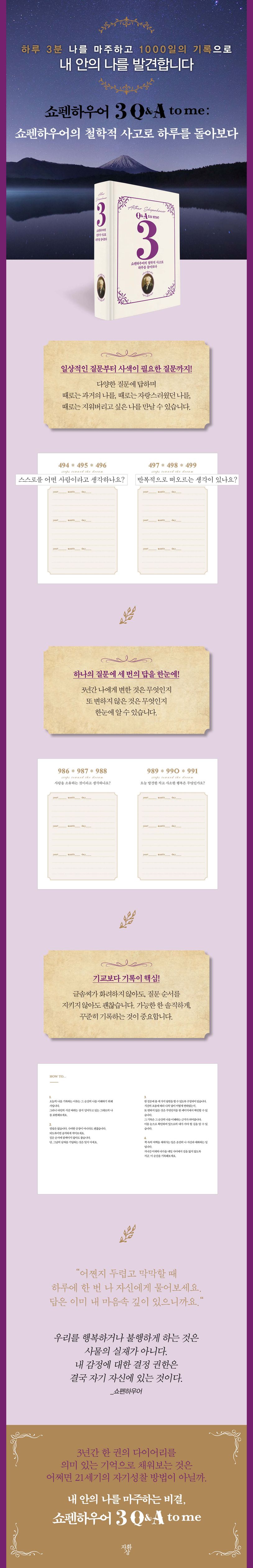 이 책은 쇼펜하우어의 철학적 사고를 테마로 한 Q&A 다이어리로, 3년간 하루에 한 번 책에 적힌 질문으로 나 자신을 돌아보고 느낀 바를 기록하도록 구성하였다. 때로는 과거의 나를, 때로는 자랑스러웠던 나를, 때로는 지워버리고 싶은 나를 만날 수도 있고 내 주변까지도 돌아볼 수 있다.
