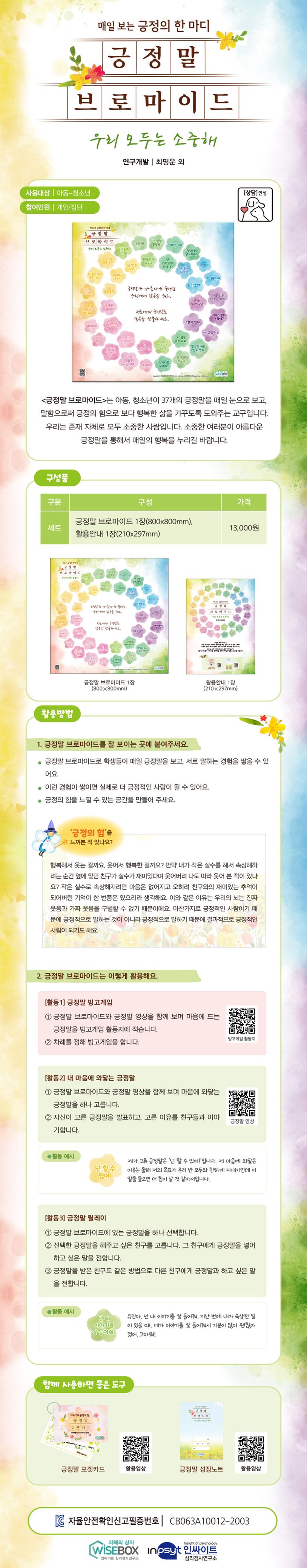 〈긍정말 브로마이드〉는 아동, 청소년이 37개의 긍정말을 매일 눈으로 보고, 말함으로써 긍정의 힘으로 보다 행복한 삶을 가꾸도록 도와주는 교구입니다.