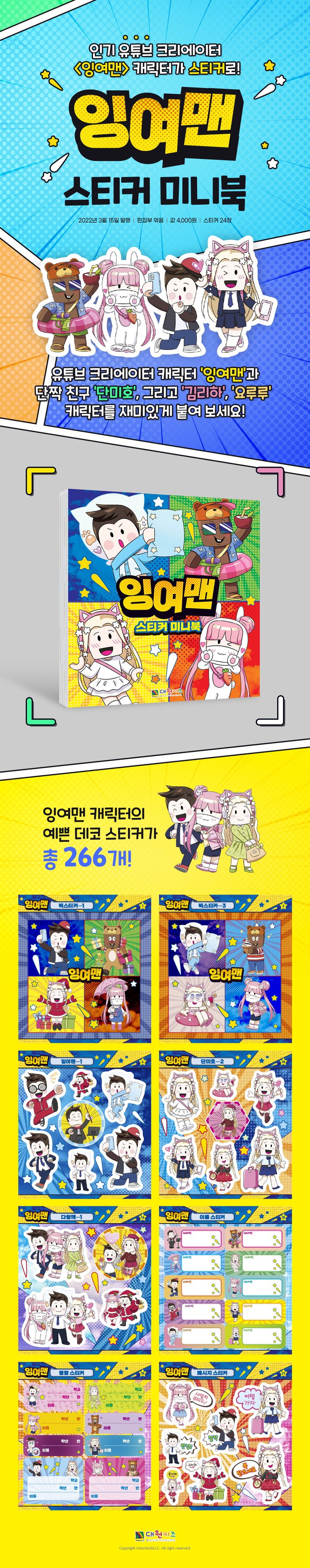 유튜브 크리에이터 캐릭터 ‘잉여맨’과 단짝 친구 ‘단미호’, 그리고 ‘김리하’, ‘요루루’ 등 재미있는 캐릭터를 한 번에 모아 볼 수 있어 내가 꾸미고자 하는 곳에 꾸밀 수 있는 종합 스티커놀이북