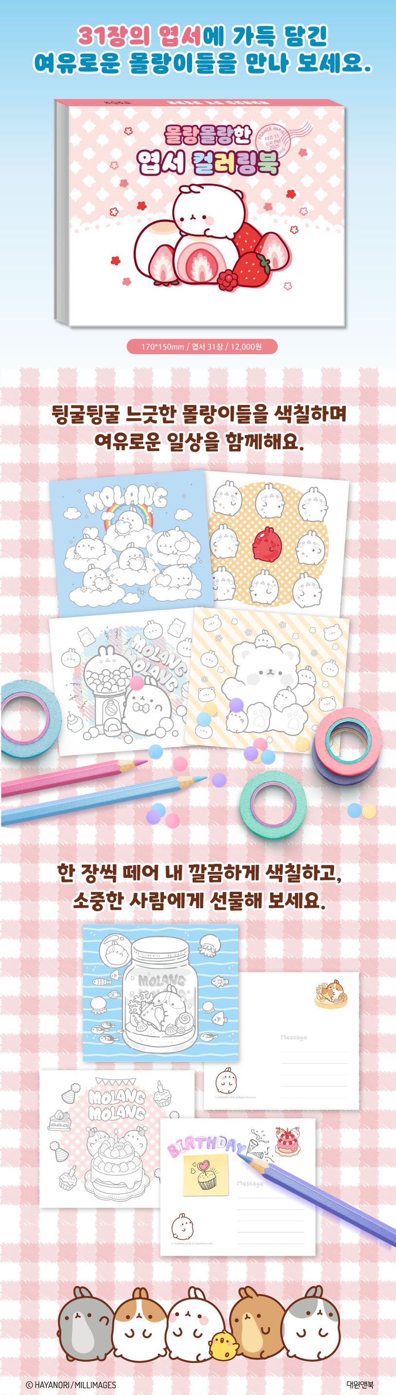 몰랑이들의 여유로운 일상이 가득한 31장의 엽서 컬러링북. 뒹굴뒹굴 느긋한 몰랑이들을 색칠하며 복잡한 생각에서 벗어나 나만의 시간에 빠져 보세요. 한 장 한 장 나만의 색깔로 채워 소중한 사람에게 선물해 보는 건 어떨까요?