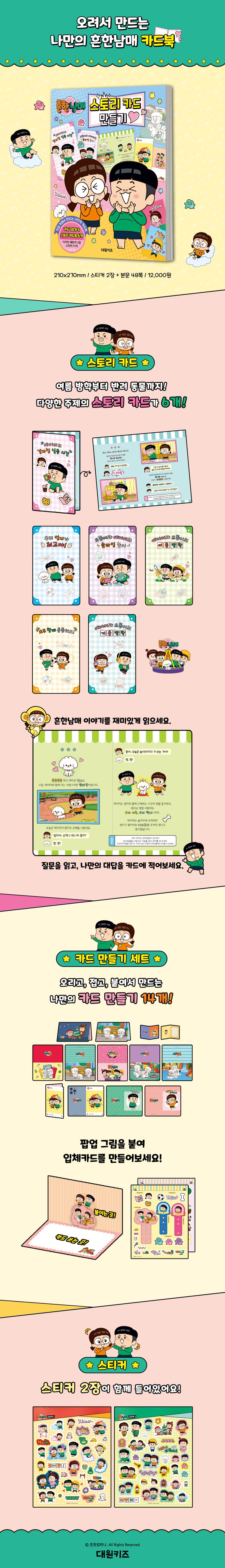 어휘력과 문장력을 길러주는 흔한남매 스토리카드 만들기. 6가지 흔한남매 이야기를 재미있게 읽은 뒤, 카드 도안을 잘라 나만의 흔한남매 카드를 만들어 보세요. 재미있는 이야기가 적힌 스토리 카드 6장, 컬러 카드 6장, 컬러링 카드 4장, 미니 카드 4장을 만들 수 있답니다. 카드를 꾸밀 수 있는 팝업 재료와 패턴지, 스티커 수록. 카드에 나만의 이야기를 적어 가족, 선생님, 친구에게 건네면 세상에서 하나뿐인 소중한 선물이 될 거예요.