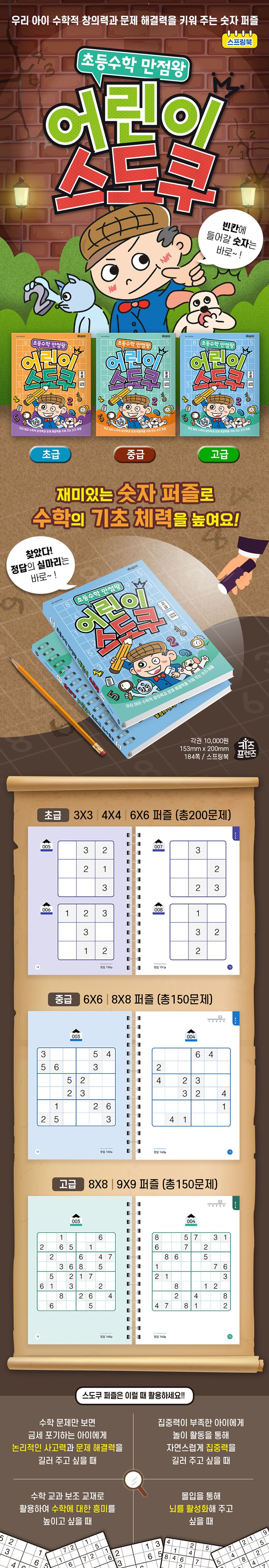 이 책 『 초등수학 만점왕 어린이 스도쿠』는 각자의 수준에 맞게 선택할 수 있도록 초급·중급·고급 3권으로 구성되어 있습니다. 3×3, 4×4, 6×6, 8×8, 9×9 퍼즐 총 500문제를 담았습니다. 각 문항은 뇌의 활성화와 지능을 향상할 수 있도록 빅데이터 분석을 통해 정교하게 설계된 지능형 문제들입니다. 이제 우리 아이 생각하는 힘을 키워 창의적인 문제해결력을 키우고 싶다면 오늘부터 스도쿠로 시작해 보세요!