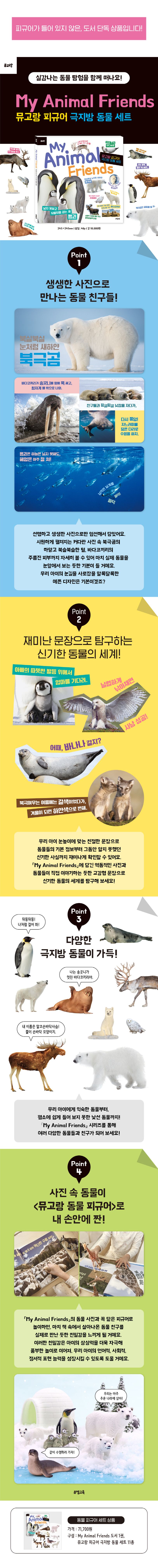 『My Animal Friends』 시리즈는 생동감 넘치는 고화질 사진으로 동물 친구들을 만날 수 있는 동물 사진 책입니다. 그중 극지방 동물 세트에는 아이들이 좋아하는 여러 극지방 동물들을 담았습니다. 펭귄은 똘똘 뭉쳐 무엇을 하는 걸까요? 바다표범은 왜 얼음 구멍 밑에서 두리번대고 있을까요? 순록이 우르르 모여 어디를 가고 있는 걸까요? 『My Animal Friends』 시리즈 속 생생한 사진과 재미나게 풀어 낸 동물 정보를 보며 우리 아이가 좋아하는 동물 친구들의 이름과 그 특징을 알아보세요!