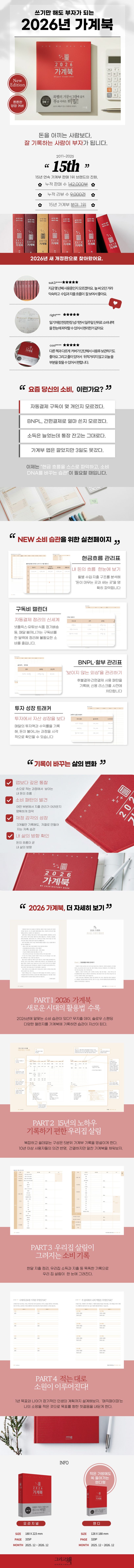 특히 2026년도에는 시대의 흐름을 반영하여 항목 분류를 새롭게 업그레이드하고 구독경제, 간편결제, BNPL(후불결제), 경험 중심의 소비, 소액 투자 등 변화된 지출 구조를 놓치지 않도록 설계되었다. 15년간 가계북 분야 판매 1위의 노하우를 담아 새로운 소비 환경에 최적화된 자산 관리 도구로 완성했다.