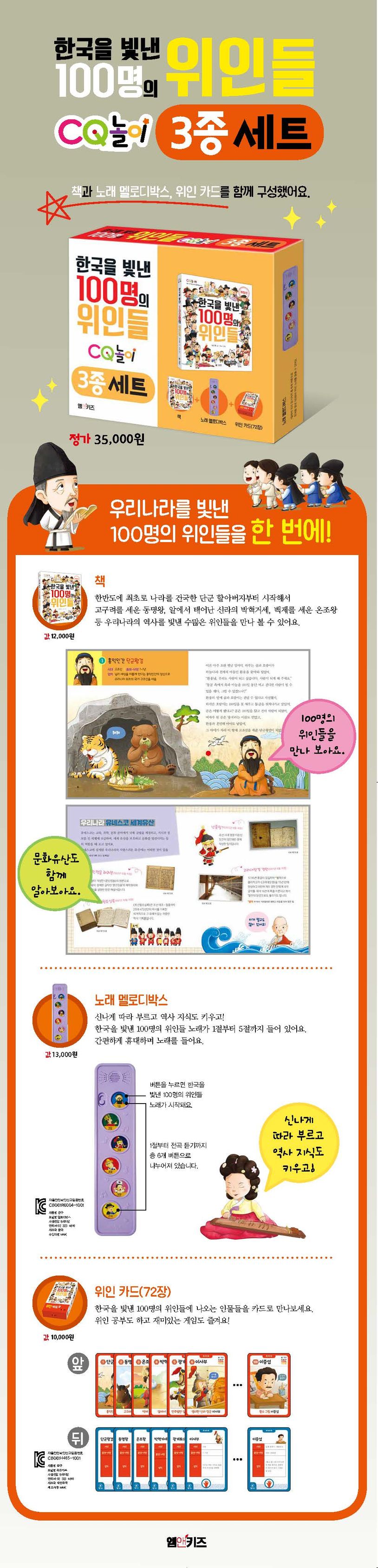 《도서》한국을빛낸100명의위인들(개정판)교과연계1학년2학기통합1.여기는우리나라2학년1학기국어11.상상의날개를펴요2학년2학기국어7.일이일어난차례를살펴요2학년2학기국어11.실감나게표현해요초등학생이꼭알아야할우리나라위인100명!《한국을빛낸100명의위인들》은노래가사말을바탕으로다담지못한내용을쉽고재미있게이야기를풀어낸책입니다.한반도에최초로나라를건국한단군할아버지부터시작해서고구려를세운동명왕,알에서태어난신라의박혁거세,백제를세운온조왕,임진왜란때왜군을무찌른영웅이순신,일제강점기이땅의독립을위해싸운독립운동가안중근,3.1만세운동의유관순,별헤는밤의윤동주등우리나라의역사를빛낸수많은위인들을만나볼수있어요.한권에우리나라아름다운문화유산소개와인기두뇌놀이역사를알아가며우리나라아름다운문화유산과책속부록다른그림찾기,그림퍼즐,낱말퍼즐,등인기두뇌놀이가다모여있어요.지루할틈없이우리나라위인도알고게임도풀어보세요.어린이여러분,<한국을빛낸100명의위인들>이라는노래를알고있나요?우리민족의오랜역사를한눈에훑어볼수있는멋진노래죠?아마이책을읽는친구들도책제목을보자마자신나게노래부터흥얼거릴거라생각해요.우리역사를살펴보면좋았던시절도있고,힘들었던시절도있었어요.또나라를위해목숨을바친영웅도있고,뛰어난학자,예술가도있지만,나라를위기에빠뜨린사람도있었어요.나쁜일은쏙빼고좋은것만기록한다면올바른역사기록이아니에요.영광스러운순간도,그렇지않은순간도역사라는거대한시간의탑에그대로기록하여후손들에게전해야하죠.자,이제《한국을빛낸100명의위인들》을펼쳐보세요.전세계그어느민족보다우수한DNA를가진우리민족의지혜와용기를어린이여러분도배우고본받아우리역사를빛내는멋진주인공이되길바랍니다.《위인카드》카드위인목록도서)한국을빛낸100명의위인들나오는모든인물위인카드의특징*한국을빛낸100명의위인들에나오는인물들을카드로만나볼수있어요.*한눈에한국을빛낸위인들을인식하기쉽도록앞뒤면에설명하였습니다.*별★~★★★★★★,가위바위보를카드별로차등하게넣어서게임을할수있게하였습니다.《멜로디박스》*인증유형:안전확인CB061R6004-1001