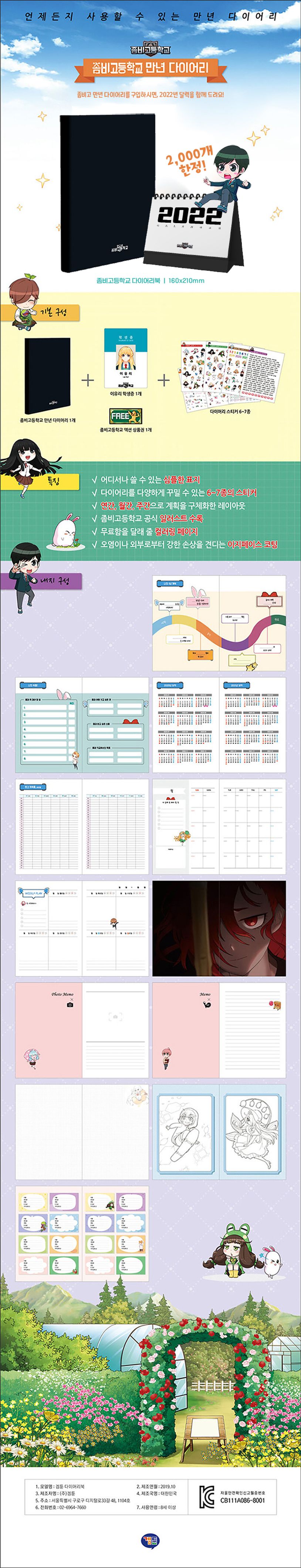 나만의 소중한 시간들을 담을 수 있는 『좀비고등학교 다이어리』. 오염이나 외부로부터의 강한 손상을 견디는 이지페이스 코팅으로 제작되었습니다. 나에 대해 정리해보는 '나의 소개', 친구들과 스티커를 교환할 수 있는 '비밀 스티커', 희망 목표를 알차게 세울 수 있는 '올해의년 목표', 이 달의 계획을 정리해보는 '이 달에 할 일', 일주일의 계획을 구체적으로 정리하고 되돌아볼 수 있는 'Weekly Plan'으로 구성되어 있습니다.