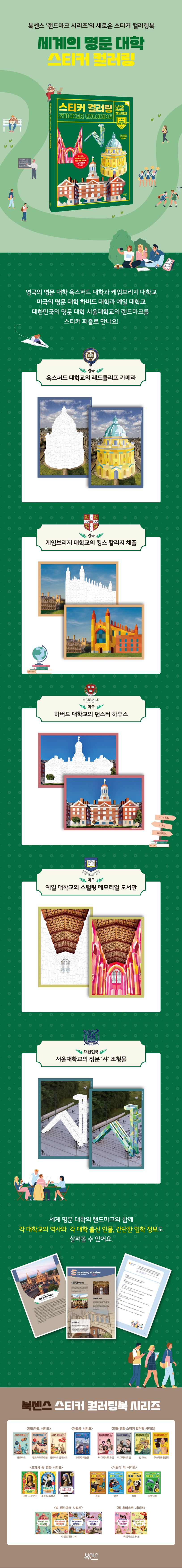 북센스의 랜드마크 시리즈 《스티커 컬러링 세계의 명문 대학》에서는 영국의 오랜 역사를 간직한 옥스퍼드 대학교의 보들리언 도서관의 열람실로 사용되는 래드클리프 카메라와 케임브리지 대학교의 킹스 칼리지 채플을 미국의 아이비리그 명성에 빛나는 하버드 대학교의 기숙사 던스터 하우스와 예일 대학교의 수많은 자료를 소장하고 있는 스털링 메모리얼 도서관을 대한민국은 서울대학교 정문의 조형물이며 서울대학교를 상징하는 ‘샤’를 스티커 퍼즐로 즐길 수 있다. 거기에 더해 각 대학에서 꼭 가봐야 할 곳을 알려준다. 간략하지만 각 대학의 입학 정보도 담고 있어 스티커 퍼즐도 즐기면서 각 대학의 역사와 이야기를 찾는 재미도 쏠쏠하다.