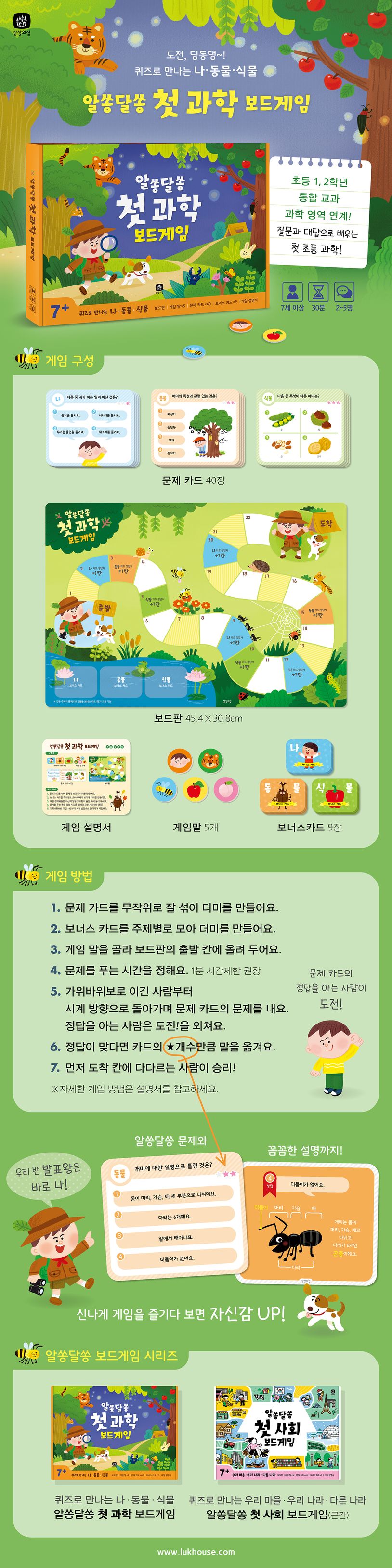 『알쏭달쏭 첫 과학 보드게임』은 문제 카드를 보고 정답을 맞히는 보드게임이에요. 보드판과 게임 말 5개, 보너스 카드 9장, 초등 1, 2학년 통합 교과 과학 영역과 연계된 ‘나, 동물, 식물’에 대한 40개 질문 카드가 담겨 있습니다. 카드에 표시된 ★ 개수만큼 말을 옮기며 ‘도착 칸’에 먼저 다다르면 승리해요. 알쏭달쏭 질문과 카드 뒷면의 꼼꼼한 설명, 그리고 게임에 재미를 더해 줄 보너스 카드까지! 게임을 신나게 즐기다 보면 자신감과 표현력이 쑥쑥 자라요. 퀴즈의 정답을 안다면 도전을 외치세요! 우리 반 발표왕이 되는 건 시간문제랍니다.