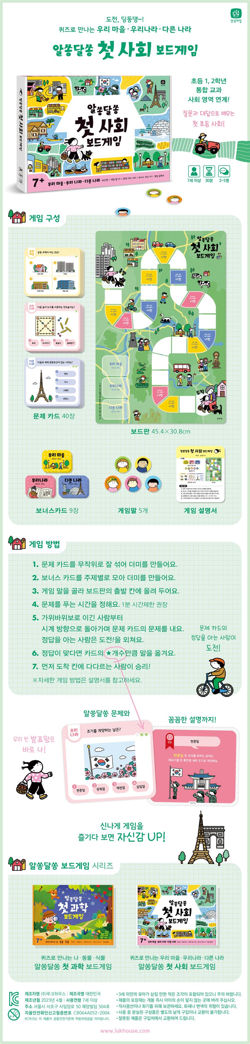 『알쏭달쏭 첫 사회 보드게임』은 문제 카드를 보고 정답을 맞히는 보드게임이에요. 보드판과 게임 말 5개, 보너스 카드 9장, 초등 1, 2학년 통합 교과 사회 영역과 연계된 ‘우리 마을, 우리나라, 다른 나라’에 대한 40개 질문 카드가 담겨 있습니다. 카드에 표시된 ★ 개수만큼 말을 옮기며 ‘도착 칸’에 먼저 다다르면 승리해요. 알쏭달쏭 질문과 카드 뒷면의 꼼꼼한 설명, 그리고 게임에 재미를 더해 줄 보너스 카드까지! 게임을 신나게 즐기다 보면 자신감과 표현력이 쑥쑥 자라요. 퀴즈의 정답을 안다면 ‘도전’을 외치세요! 우리 반 발표왕이 되는 건 시간문제랍니다.