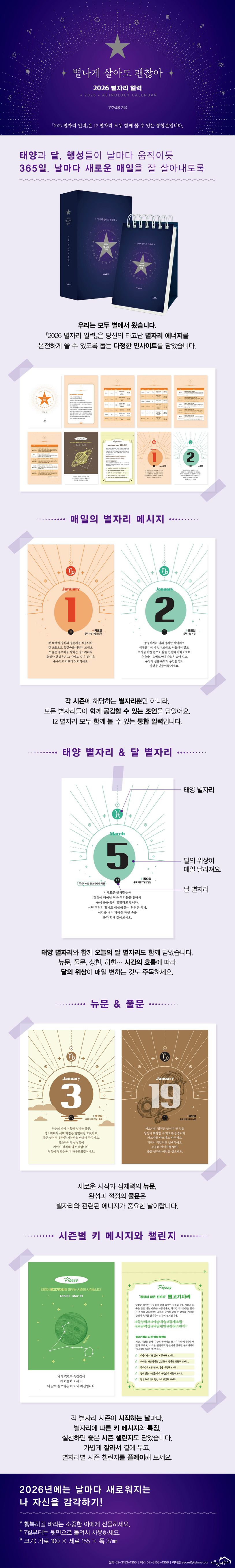 우리는 모두 별에서 왔습니다. 무한한 우주의 숨결로 태어나, 지구별에서 각자의 생을 살아갑니다. 《2026 별자리 일력》은 우주와 상응하며 당신의 타고난 별자리 에너지를 온전하게 쓸 수 있도록 돕는 다정한 인사이트를 담았습니다. 우리는 다층적 존재로, 우주만큼 무한하면서도 먼지만큼 작기도 합니다. 그 사이에서 균형을 잡고 하루하루 깨어 사랑으로 연결되길 바라는 마음을 담았습니다. 일력을 펼치는 순간, 당신은 더 이상 혼자가 아닙니다. 태양과 달, 행성들이 날마다 움직이듯, 날마다 새로워지는 당신을 생생히 감각하고 생을 실험해 보세요. 당신은 더 강하고 아름다워질 거예요.