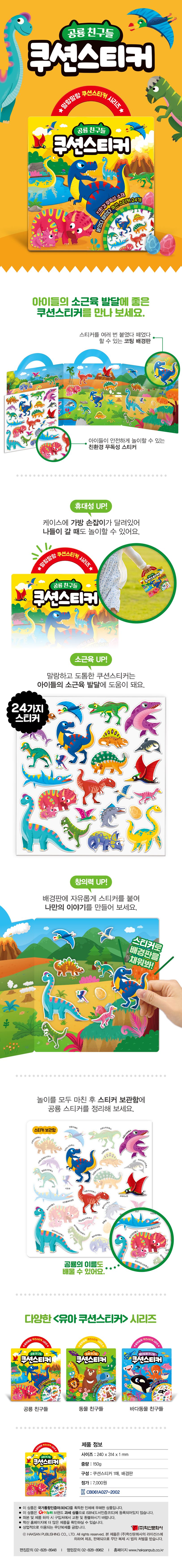 공룡캐릭터를붙였다떼었다말랑말랑한쿠션스티커로만나보세요!하나,붙였다떼었다무한반복쿠션스티커!친환경무독성스티커로끈적임없이붙였다떼었다반복해서놀수있습니다.둘,놀면서단어학습과인지력이쑥쑥!재밌는스티커놀이를하면서스티커이미지와단어를함께반복해보면서놀면단어학습력과인지력을키울수있습니다.셋,케이스200%활용하기!케이스를넓게펼치면안쪽에스티커를붙이고놀수있는배경판이돼요!원하는곳에스티커를이곳저곳붙이며나만의이야기를만들수있어더욱더재밌습니다.스티커놀이가끝나면스티커보관함에알맞은자리에붙이면스티커한개도잃어버릴걱정없겠죠?
