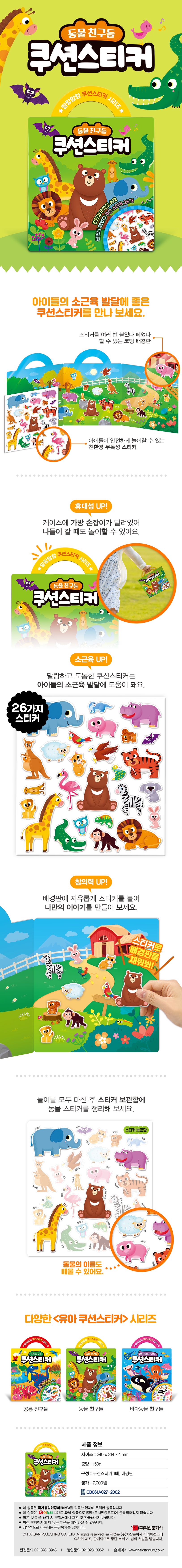 동물캐릭터를붙였다떼었다말랑말랑한쿠션스티커로만나보세요!하나,붙였다떼었다무한반복쿠션스티커!친환경무독성스티커로끈적임없이붙였다떼었다반복해서놀수있습니다.둘,놀면서단어학습과인지력이쑥쑥!재밌는스티커놀이를하면서스티커이미지와단어를함께반복해보면서놀면단어학습력과인지력을키울수있습니다.셋,케이스200%활용하기!케이스를넓게펼치면안쪽에스티커를붙이고놀수있는배경판이돼요!원하는곳에스티커를이곳저곳붙이며나만의이야기를만들수있어더욱더재밌습니다.스티커놀이가끝나면스티커보관함에알맞은자리에붙이면스티커한개도잃어버릴걱정없겠죠?