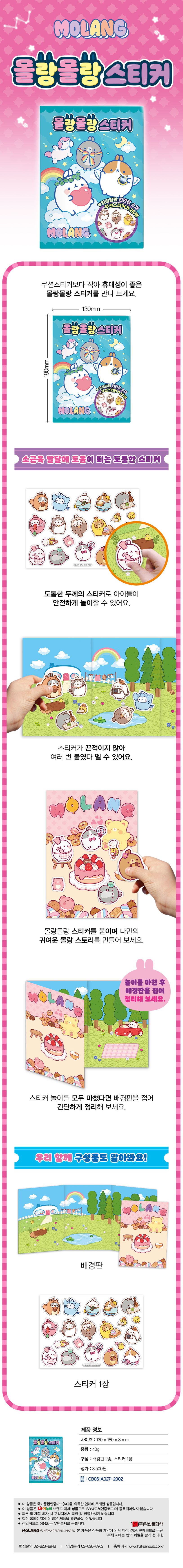몰랑이와피우피우가가득있는스티커를붙였다떼었다몰랑몰랑스티커로만나보세요.하나,붙였다떼었다무한반복몰랑몰랑스티커!친환경무독성스티커로끈적임없이붙였다떼었다반복해서놀수있습니다.셋,케이스활용하기!케이스를넓게펼치면안쪽에스티커를붙이고놀수있는배경판이돼요!원하는곳에스티커를이곳저곳붙이며나만의이야기를만들수있어더욱더재밌습니다.