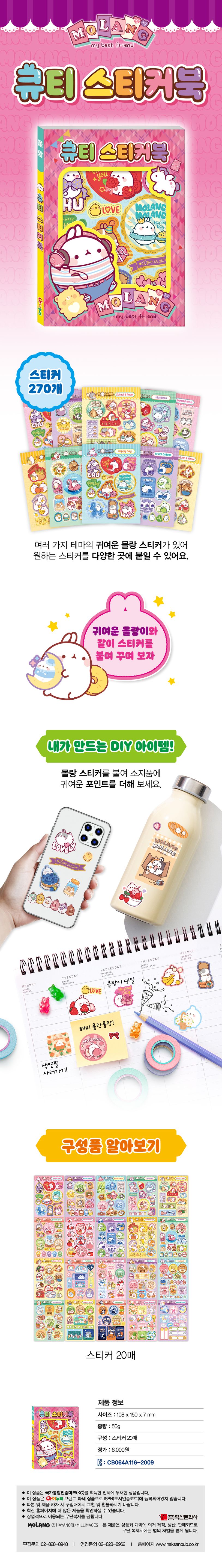 귀여운몰랑이와친구들이가득들어있는큐티스티커북270가지다양한스티커가있어마음대로골라붙일수있어요.첫번째,내가꾸미고싶은소지품에스티커를붙여보세요.귀여운몰랑이스티커로소지품을나만의포인트아이템으로변신시킬수있어요.두번째,다이어리를몰랑이와친구들로꾸며보세요.나만의일기장에다양한몰랑이스티커를붙여예쁘게꾸며보세요.