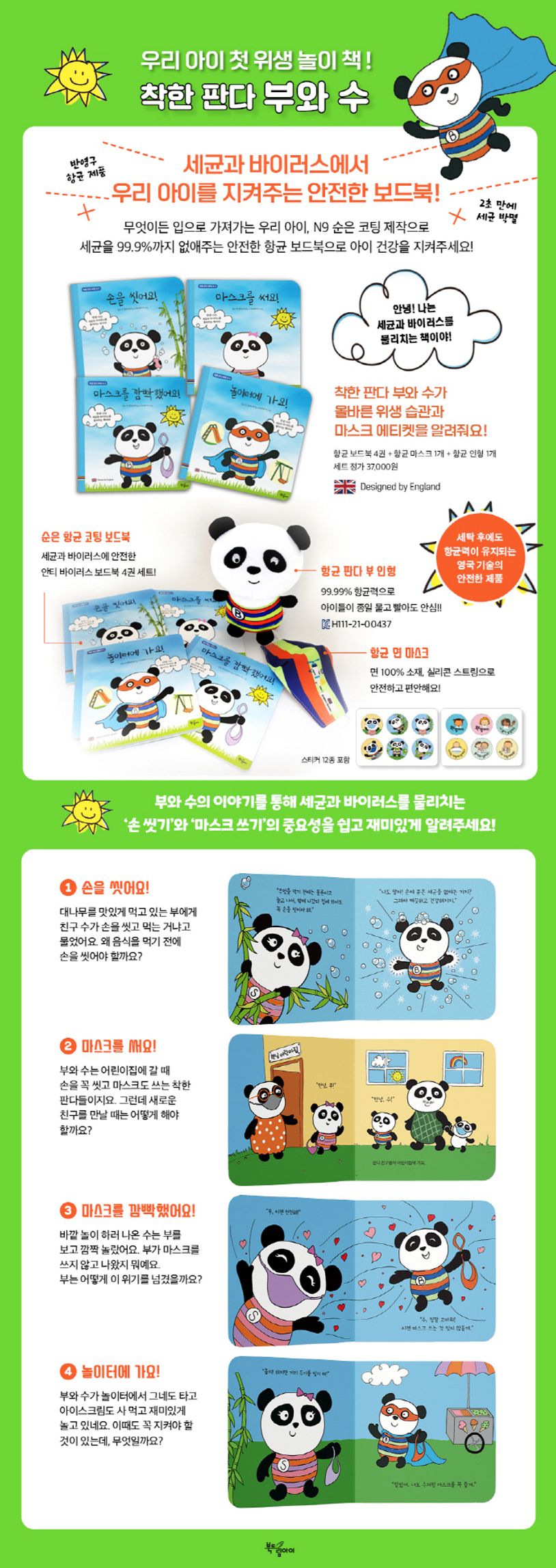 착한 판다 부와 수 시리즈’는 영국의 항균 기업 실버 앤 뱀부에 다니는 제작자의 열한 살 된 딸의 아이디어로부터 시작되었어요. 유아들이 바이러스와 병균으로부터 스스로를 지킬 수 있는 위생 교육을 자연스럽게 받아들일 수 있도록 판다 캐릭터로 스토리북을 만들었고, 캐릭터를 이용한 애착 인형과 마스크를 함께 제작해 친밀감을 높였답니다. 천연 항균성 대나무 원료와 N9 순은을 사용한 99.9% 반영구 항균 제품이므로 바이러스와 세균으로부터 아이들을 지켜줘요.