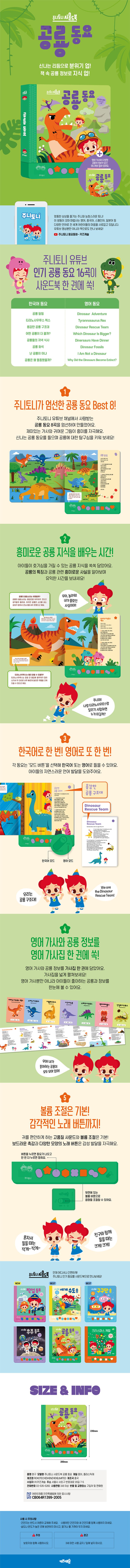 ‘주니토니 사운드북 공룡 동요’는 주니토니 유튜브 채널에서 사랑받고 있는 공룡 동요 중 8곡을 엄선하여 만들었어요. ‘어떤 공룡이 더 클까?, 티라노사우루스 렉스, 공룡 왜 멸종했을까?’ 등 동요를 흥얼거리다 보면 자연스럽게 공룡의 종류와 특징을 알 수 있어요. 책 속에는 ‘공룡 이름은 어떻게 지어졌을까?’ ‘티라노사우루스는 빨리 달릴 수 있었을까?’ 등 유익한 지식 정보가 가득해요. 그동안 알지 못했던 공룡에 대한 흥미로운 사실을 알아가며 재미를 느껴보세요. 공룡 세계에 대한 상상력을 높이고 공룡에 대한 관심을 키울 수 있어요. ‘주니토니 사운드북 공룡 동요’는 한국어뿐만 아니라 영어 동요도 수록하여 아이들의 영어 학습을 자연스럽게 도와주어요. 중독성 있는 멜로디로 많은 아이들에게 사랑받는 주니토니 공룡 동요! 한 곡 한 곡 섬세하게 담아 완성한 고품질 동요를 사운드북으로 만나보세요!