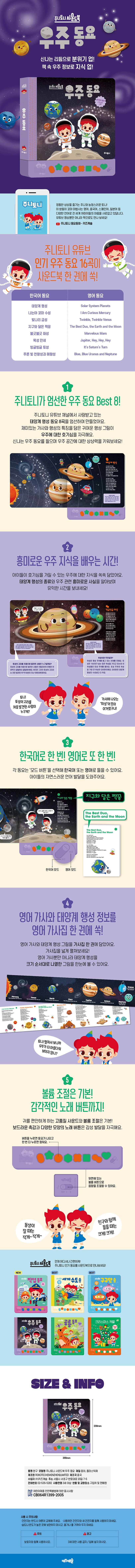 ‘주니토니 사운드북 우주 동요’는 주니토니 유튜브 채널에서 사랑받고 있는 우주 관련 동요 중 태양계 행성 동요 8곡을 엄선하여 만들었어요. ‘나는야 꼬마 수성, 지구와 달은 짝꿍, 빙글빙글 토성’ 등 동요를 흥얼거리다 보면 자연스럽게 태양계 행성의 종류와 특징을 알 수 있어요. 책 속에는 ‘달의 모양이 변하는 이유는 무엇일까?’, ‘태양계에서 가장 큰 행성은 무엇일까?’ 등 유익한 정보가 가득해요. 그동안 알지 못했던 우주에 대한 흥미로운 사실을 알아가는 재미를 느껴보세요. 태양계 행성을 비롯한 우주 공간에 대한 상상력을 높일 수 있어요. ‘주니토니 사운드북 우주 동요’는 한국어뿐만 아니라 영어 동요도 수록하여 아이들의 영어 학습을 자연스럽게 도와주어요. 중독성 있는 멜로디로 많은 아이들에게 사랑받는 주니토니 우주 동요! 한 곡 한 곡 섬세하게 담아 완성한 고품질 동요를 사운드북으로 만나보세요!