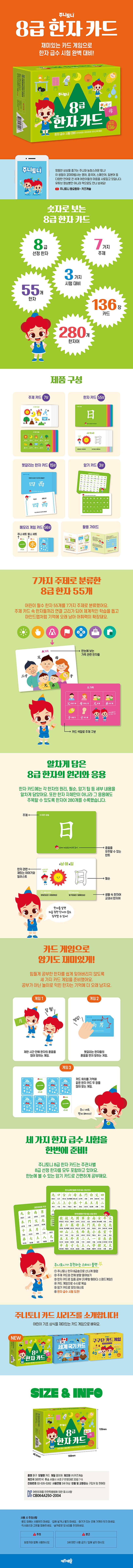 한자 카드에는 세 주관사별 8급 선정 한자의 원리, 필순, 활용 한자어, 암기 팁까지 알차게 담았어요. 익힌 한자들을 재미있는 카드 게임으로 복습하고 ‘주니토니 한자송’을 부르면 암기 효과를 높일 수 있어요.