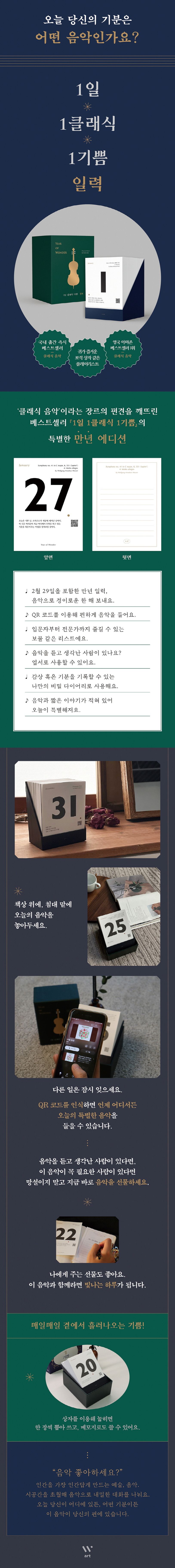 2월 29일을 포함한 만년 형태로 나온 이 일력은 QR 코드를 통해 그날에 딱 맞게 고른 최선의 클래식 음악 한 곡을 선사한다. 정통과 파격을 넘나드는 풍부한 선곡 리스트는 클래식 입문자는 물론 클래식에 정통한 애호가들의 귀도 놀라게 할 준비가 되어 있다. 책 원문에서 곡별로 발췌한 핵심적인 한 줄이 기분 좋은 한 해의 루틴을 만드는 자양분이자 단단한 교양 지식이 될 것이다.