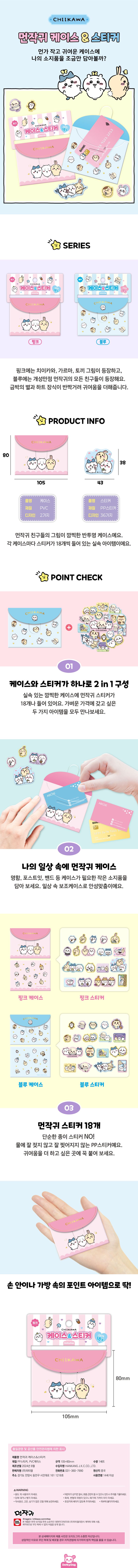 - 핑크케이스에는 치이카와 가르마 토끼 그림이 등장하고, 블루 케이스에는 개성만점 먼작귀의 모든 친구들이 등장해요. 금박으로 반짝이는 별과 하트 장식이 귀여움을 더해줍니다.