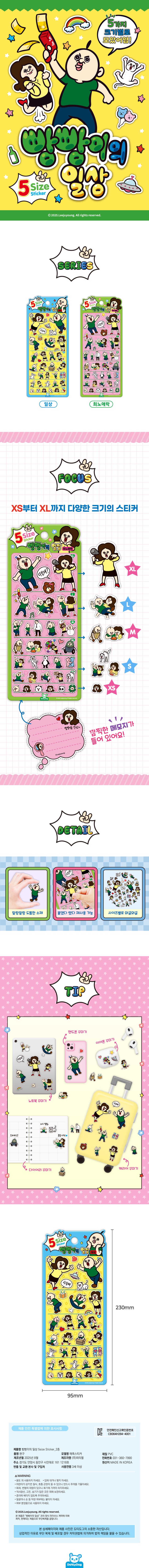 - 스티커 : 투명한 젤리 느낌의 빵빵이 스티커를 만나보세요. 붙였다 뗐다 재사용이 가능하며 XS부터 XL까지 5가지 크기별로 귀엽고 깜찍한 그림을 모았어요. 내 소지품에 빵빵이 친구들을 붙여보세요. 꾸미기에 필요한 크기들을 모아 사이즈별로 분류했답니다. 내 소지품 크기에 맞에 쏙쏙 골라 붙이기에 활용만점이에요.