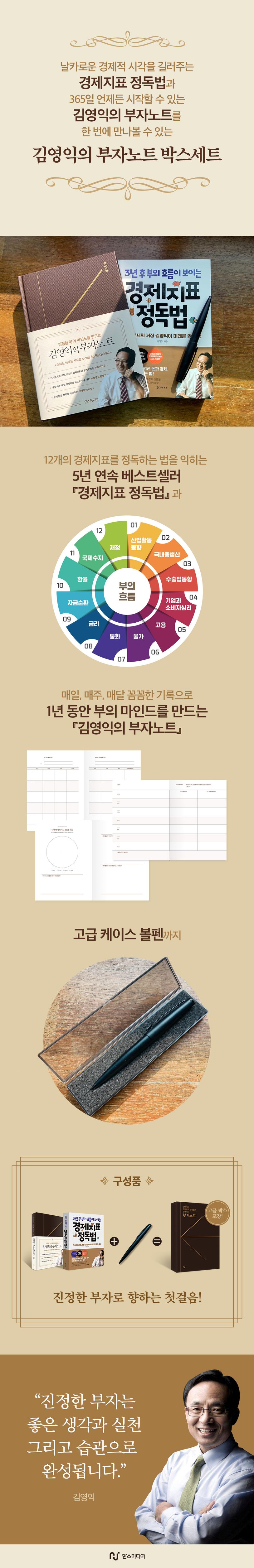 “김영익의 경제지표 정독법과 함께하는 부자노트”는 『김영익의 부자노트』와 『3년 후 부의 흐름이 보이는 경제지표 정독법』 그리고 고급 케이스 볼펜까지 한 번에 구매할 수 있도록 기획된 세트다. 독자들은 『경제지표 정독법』을 통해 거시경제의 거장 김영익 교수의 시선으로 부의 흐름을 파악하고 미래에 대한 안목을 기른 뒤, 『김영익의 부자노트』를 쓰면서 그 안목을 습관으로 체화해 진정한 부를 쌓는 데 첫걸음을 내딛을 수 있다.