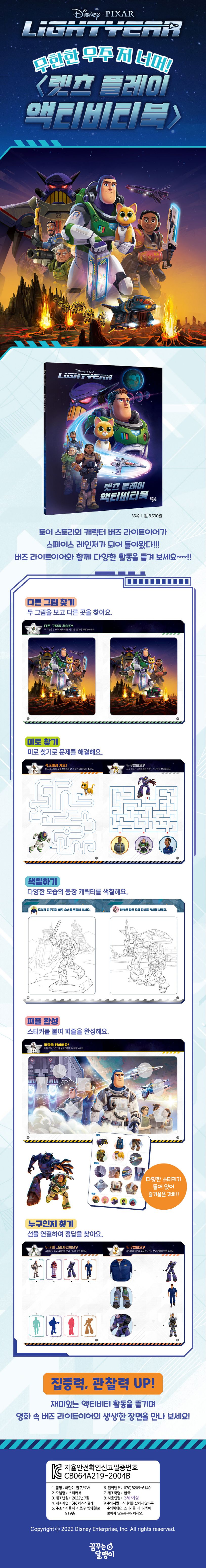 〈버즈 라이트이어 렛츠 플레이 액티비티북〉으로 디즈니-픽사의 애니메이션 ‘버즈 라이트이어’에 등장하는 캐릭터와 함께 재미있고 다양한 활동을 할 수 있어요.