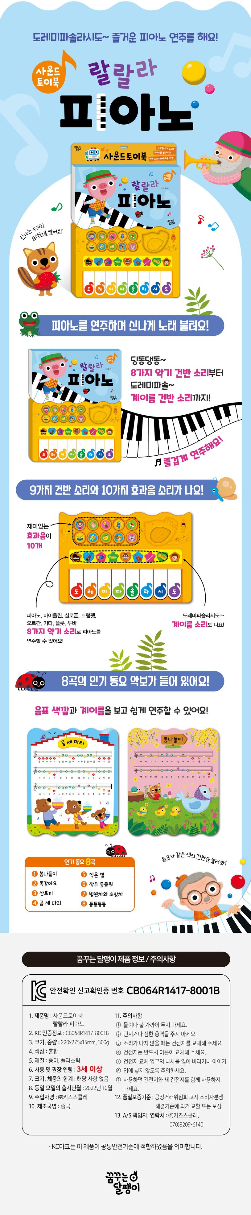〈랄랄라 피아노〉는 8가지 악기 소리로 피아노를 연주할 수 있어요. 또한 건반을 누르면서 자연스럽게 계이름까지 익힐 수 있지요. 딩동댕동 랄랄라 피아노 치며 신나는 우리 집 음악회를 열어 보세요!